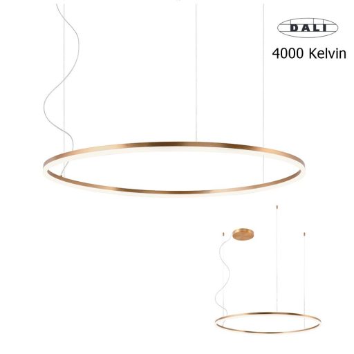 Design függeszték bronz színű fém, 28cm átmérőjű fém központi elemmel, 100cm átmérőjű fémgyűrű búrával és 68W hideg fehér fényű beépített LED fényforrással. A lámpa Dali világításvezérelt hálózatra kötve fényerőszabályozható. Dali rendszer különálló lámpák és világítási csoportok vezérlésére alkalmas rendszer. Ennek kiépítéséről kérje villanyszerelő szakember segítségét.