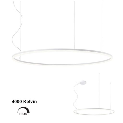 Design függeszték matt fehér színű fém, 28cm átmérőjű fém központi elemmel, 120cm átmérőjű fémgyűrű búrával és 76W hideg fehér fényű beépített LED fényforrással. Triac változat, egy külön vásárolható speciális kapcsoló segítségével fényerőszabályozható. A kapcsolóról érdeklődjön ügyfélszolgálatunkon.