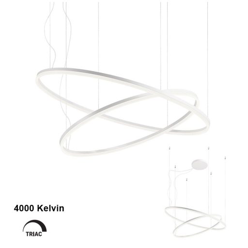 Design függeszték matt fehér színű fém központi elemmel gyűrű alakú búrákkal (átmérőjük 60 és 100cm) és függesztő elemekkel, 40,5 +68W beépített hideg fehér fényű LED fényforrással. A gyűrűk belógása illetve annak szöge a függesztő elemek segítségével állítható. Triac változat, egy külön vásárolható speciális kapcsoló segítségével fényerőszabályozható. A kapcsolóról érdeklődjön ügyfélszolgálatunkon.