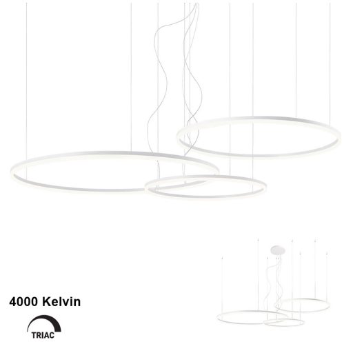 Design függeszték matt fehér színű fém központi elemmel gyűrű alakú búrákkal (átmérőjük 60, 80 és 100cm) és függesztő elemekkel, 40,5W+ 55W +68W beépített hideg fehér fényű LED fényforrással. A gyűrűk belógása illetve annak szöge a függesztő elemek segítségével állítható.Triac változat, egy külön vásárolható speciális kapcsoló segítségével fényerőszabályozható. A kapcsolóról érdeklődjön ügyfélszolgálatunkon.