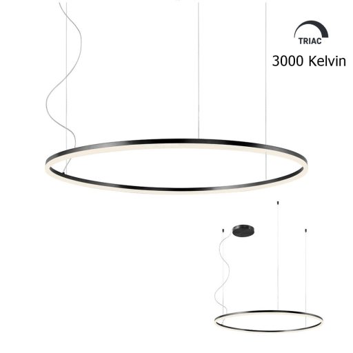 Design függeszték matt fekete színű fém, 28cm átmérőjű fém központi elemmel, 100cm átmérőjű fémgyűrű búrával és 68W meleg fehér fényű beépített LED fényforrással. Triac változat, egy külön vásárolható speciális kapcsoló segítségével fényerőszabályozható. A kapcsolóról érdeklődjön ügyfélszolgálatunkon.
