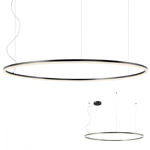 Design függeszték matt fehér színű fém központi elemmel, 150cm átmérőjű gyűrű alakú búrával és függesztő elemekkel, beépített meleg fehér színhőmérsékletű LED fényforrással. Triac változat, egy külön vásárolható speciális kapcsoló segítségével fényerőszabályozható. A kapcsolóról érdeklődjön ügyfélszolgálatunkon.