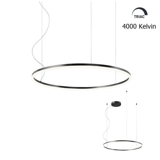 Design függeszték matt fekete színű fém, 25cm átmérőjű fém központi elemmel, 80cm átmérőjű fémgyűrű búrával és 55W hideg fehér fényű beépített LED fényforrással. Triac változat, egy külön vásárolható speciális kapcsoló segítségével fényerőszabályozható. A kapcsolóról érdeklődjön ügyfélszolgálatunkon.