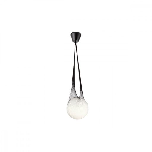 Fekete színű fém rögzítő elemes függeszték gömb alakú opál üveg búrával, fekete textil háló dekorral, ajándék LED fényforrással.