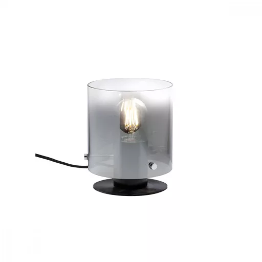 Fekete színű fém vázas asztali lámpa henger alakú füst színű üveg búrával, vezetékre szerelt kapcsolóval.