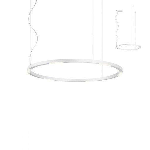 Letisztult megjelénű függeszték lámpa matt fehér színű alumínium és fém függesztő elemmel és vékony, 2,7cm vastag búrával, beépített SMD LED fényforrással.