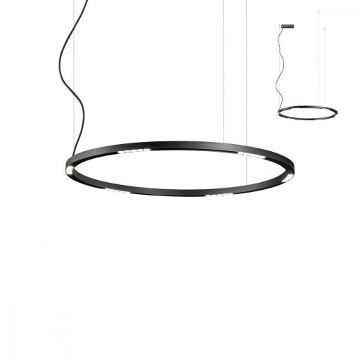Letisztult megjelénű függeszték lámpa matt fekete színű alumínium és fém függesztő elemmel és vékony, 2,7cm vastag búrával, beépített SMD LED fényforrással.