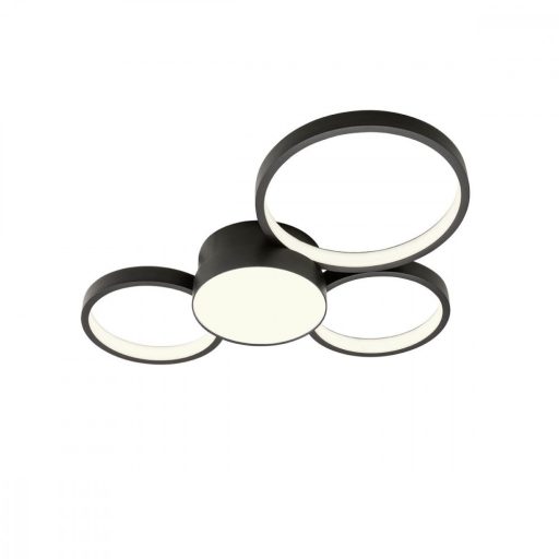 Matt fekete színre festett alumínium és fém vázas mennyezeti lámpa fehér színű akril betétes búrával, összesen 50W meleg fehér fényű, beépített LED fényforrással. A lámpa fényereje fali kapcsoló segítségével 3 lépcsőben szabályozható. A beépített LED fényforrás nem cserélhető.