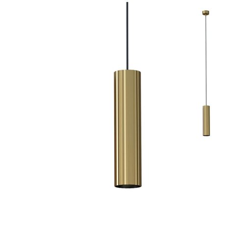 Matt arany színű fém vázas függeszték lámpa 30cm hosszú, 7cm átmérőjű bordázott, kívűl matt arany, belül matt fekete színű alumínium búrával, 1db GU10-es foglalattal.