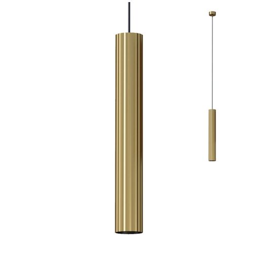 Matt arany színű fém vázas függeszték lámpa 50cm hosszú, 7cm átmérőjű bordázott, kívűl matt arany, belül matt fekete színű alumínium búrával, 1db GU10-es foglalattal.