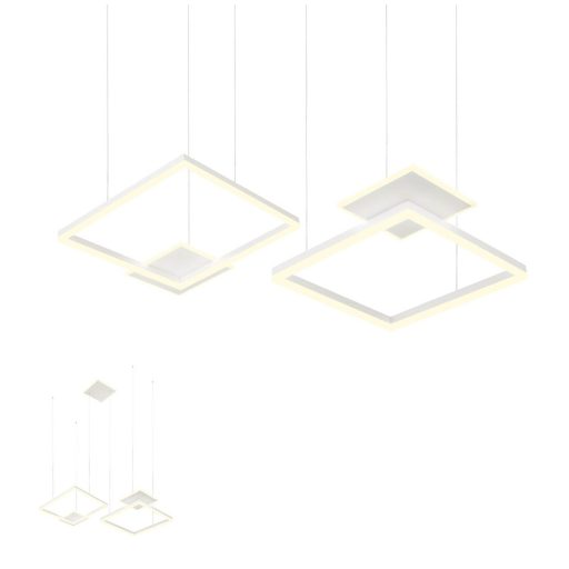 Matt fehér színre festett alumínium és fém vázas függeszték lámpa fehér színű akril betétes búrával, összesen 137W meleg fehér fényű, beépített LED fényforrással. A lámpa fényereje fali kapcsoló segítségével 3 lépcsőben szabályozható. A beépített LED fényforrás nem cserélhető.