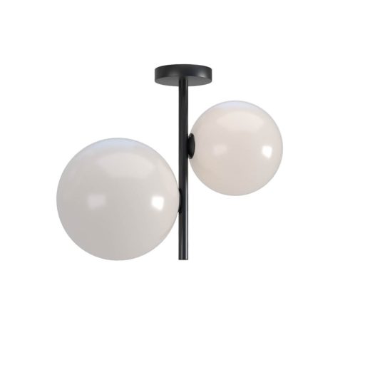 Matt fekete színű fém vázas mennyezeti lámpa opálos, gömb alakú, 25 és 20cm átmérőjű fúvott üveg búrával, 2db E27-es foglalattal. Fényforrást nem tartalmaz.
