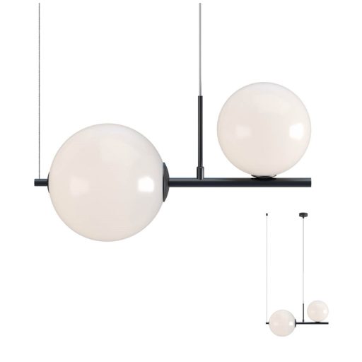 Matt fekete színű fém vázas függeszték lámpa opálos, gömb alakú fúvott üveg búrával, 2db E27-es foglalattal, textil bevonatos kábellel. Fényforrást nem tartalmaz.