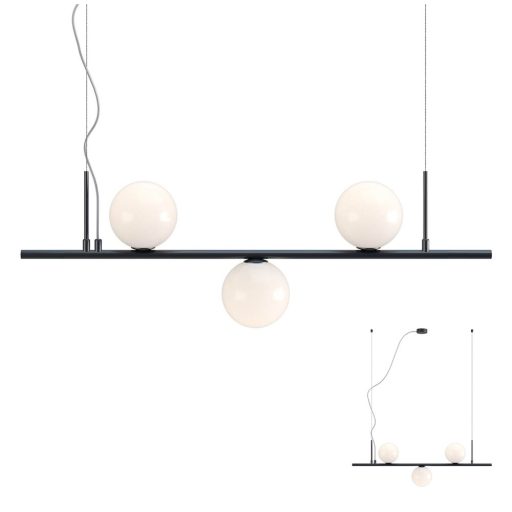 Matt fekete színű fém vázas függeszték lámpa 3db opálos, gömb alakú fúvott üveg búrával, E14-es foglalattal, textil bevonatos kábellel. Fényforrást nem tartalmaz.