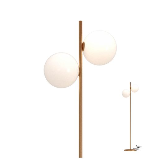 Súrolt bronz színű fém vázas álló lámpa 2db 20cm átmérőjű opálos, gömb alakú fúvott üveg búrával, 2db E27-es foglalattal. Fényforrást nem tartalmaz.