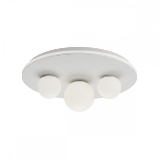 Matt fehér színű fém és alumínium vázas kerek mennyezeti lámpa körben szilikon betéttel, opál üveg búrával. A lámpa körben és a búrákon keresztül világít, összesen 48W, meleg fehér fényű beépített LED fényforrást tartalmaz.