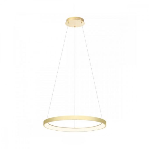 Matt arany színű fém és alumínium függesztett lámpa opálos akril betéttel, meleg fehér színhőmérsékletű beépített LED fényforrással, 58cm átmérővel. A lámpa fényereje fali kapcsoló segítségével 3 lépcsőben szabályozható.