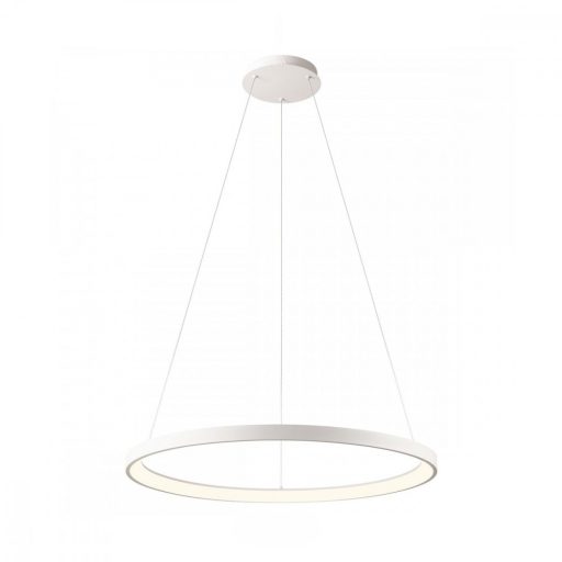 Matt fehér színű fém és alumínium függesztett lámpa opálos akril betéttel, meleg fehér színhőmérsékletű beépített LED fényforrással, 78cm átmérővel. A lámpa fényereje fali kapcsoló segítségével 3 lépcsőben szabályozható.