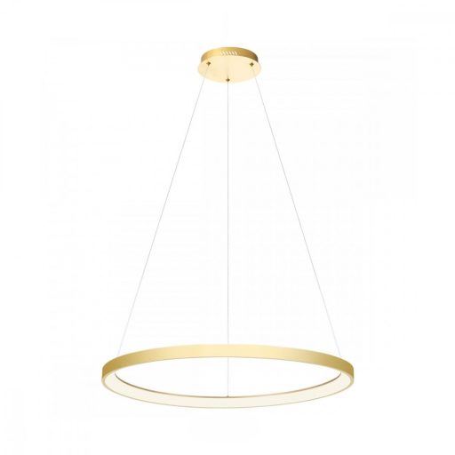 Matt arany színű fém és alumínium függesztett lámpa opálos akril betéttel, meleg fehér színhőmérsékletű beépített LED fényforrással, 78cm átmérővel. A lámpa fényereje fali kapcsoló segítségével 3 lépcsőben szabályozható.