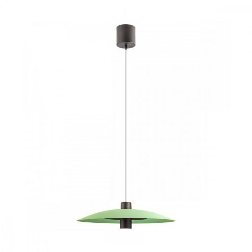 Matt fekete színű fém vázas függeszték lámpa zöld színű lámpaernyővel, meleg fehér színhőmérsékletű beépített LED fényforrással. A lámpa direkt és indirekt módon is világít. A fekete korong mögül az ernyőt világítja meg, illetve a központi LED lefelé világít.