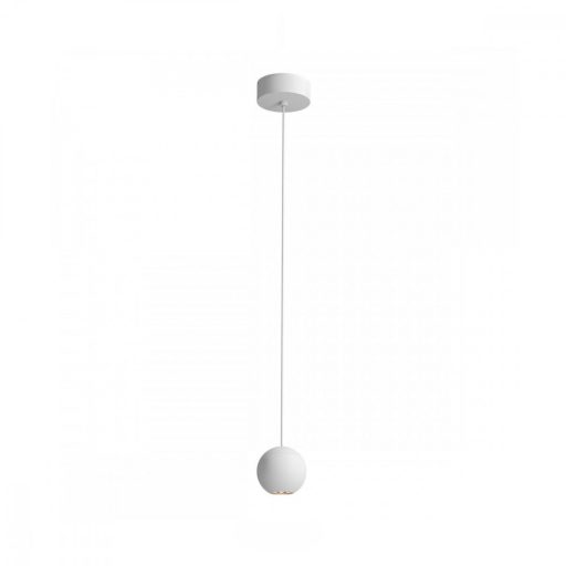 Matt fehér színű fém függeszték 7cm széles gömb alakú búrával, meleg fehér színhőmérsékletű beépített LED fényforrással.