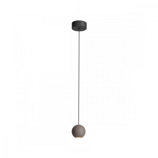 Fekete színű fém vázas függeszték 7cm széles, matt kávé színű, gömb alakú búrával, meleg fehér színhőmérsékletű beépített LED fényforrással.