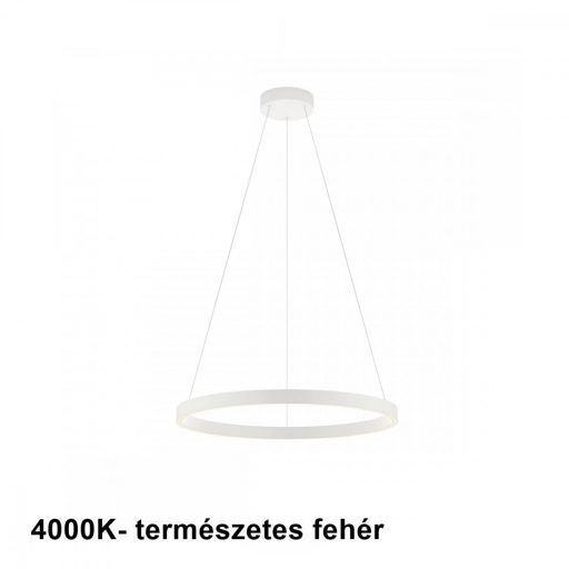 Matt fehér színű fém vázas függeszték lámpa matt fehér alumínium, szilikon betétes, 60cm átmérőjű búrával, természetes fehér színhőmérsékletű beépített LED fényforrással. A lámpa fényere fali kapcsoló segítségével 3 lépcsőben állítható.