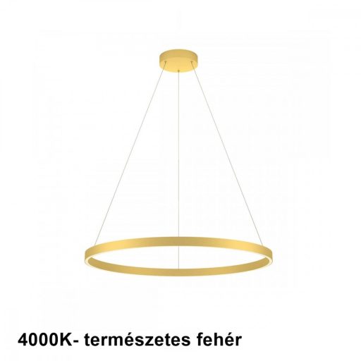 Matt arany színű fém vázas függeszték lámpa matt arany színű alumínium, szilikon betétes, 80cm átmérőjű búrával, természetes fehér színhőmérsékletű beépített LED fényforrással. A lámpa fényere fali kapcsoló segítségével 3 lépcsőben állítható.