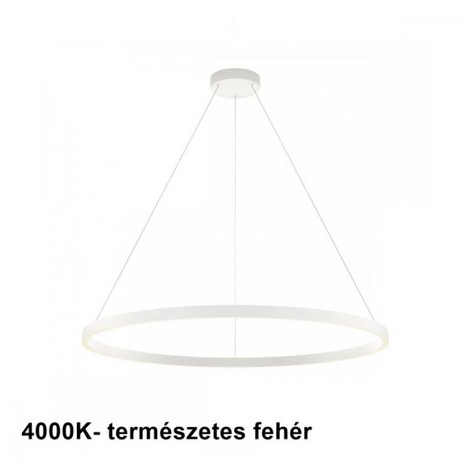 Matt fehér színű fém vázas függeszték lámpa matt fehér alumínium, szilikon betétes, 100cm átmérőjű búrával, természetes fehér színhőmérsékletű beépített LED fényforrással. A lámpa fényere fali kapcsoló segítségével 3 lépcsőben állítható.