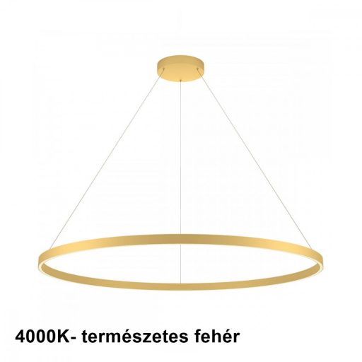 Matt arany színű fém vázas függeszték lámpa matt arany színű alumínium, szilikon betétes, 120cm átmérőjű búrával, természetes fehér színhőmérsékletű beépített LED fényforrással. A lámpa fényere fali kapcsoló segítségével 3 lépcsőben állítható.