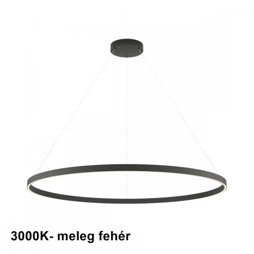 Matt fekete színű fém vázas függeszték lámpa matt fekete színű alumínium, szilikon betétes, 120cm átmérőjű búrával, meleg fehér színhőmérsékletű beépített LED fényforrással. A lámpa fényere fali kapcsoló segítségével 3 lépcsőben állítható.