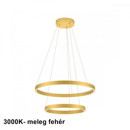 Matt arany színű fém vázas függeszték lámpa matt arany színű alumínium, szilikon betétes, 40 és 60cm átmérőjű búrákkal, meleg fehér színhőmérsékletű beépített LED fényforrással. A lámpa fényere fali kapcsoló segítségével 3 lépcsőben állítható.