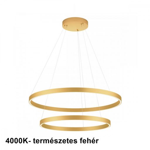Matt arany színű fém vázas függeszték lámpa matt arany színű alumínium, szilikon betétes, 60 és 80cm átmérőjű búrákkal, természetes fehér színhőmérsékletű beépített LED fényforrással. A lámpa fényere fali kapcsoló segítségével 3 lépcsőben állítható.
