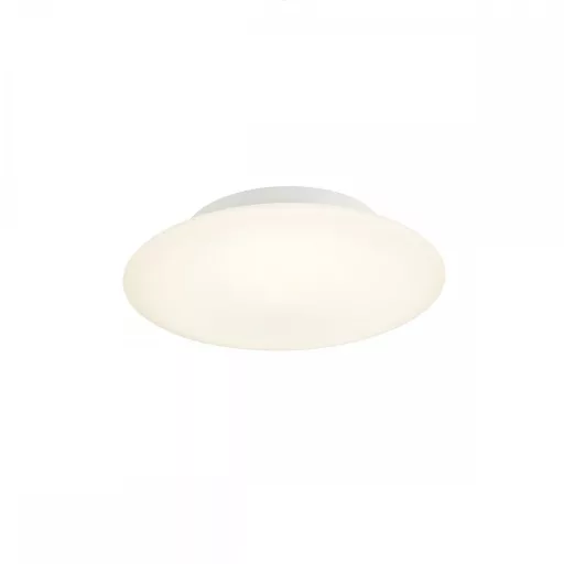 Matt fehérre festett fém vázas fürdőszobai mennyezeti lámpa opálos üveg búrával, meleg fehér színhőmérsékletű beépített LED fényforrással, IP44-es védelemmel.