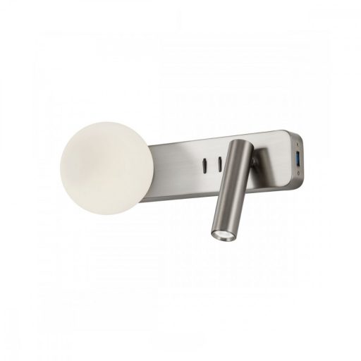 Szálcsiloszt nikkel színű fém vázas olvasókaros fali lámpa opál üveg búrával, és mozgatható olvasókarral. A lámpa oldalán USB aljzat található, illetve a lámpán 2 kapcsoló található, melyekkel külön kapcsolható a fix világítás és az olvasókar. A gömb alakú búra alatt G9-es foglalat található, az olvasókar pedig meleg fehér színhőmérsékletű beépített LED fényforrással rendelkezik.