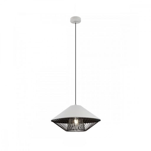 Matt fehér színű fém vázas függeszték lámpa matt fehér színű fém ernyővel, fekete fémrács betéttel, 1db E27-es foglalattal.