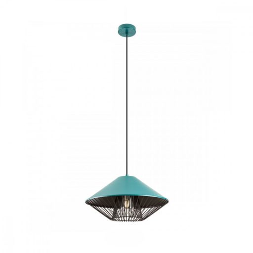 Matt zöld színű fém vázas függeszték lámpa matt zöld színű fém ernyővel, fekete fémrács betéttel, 1db E27-es foglalattal.