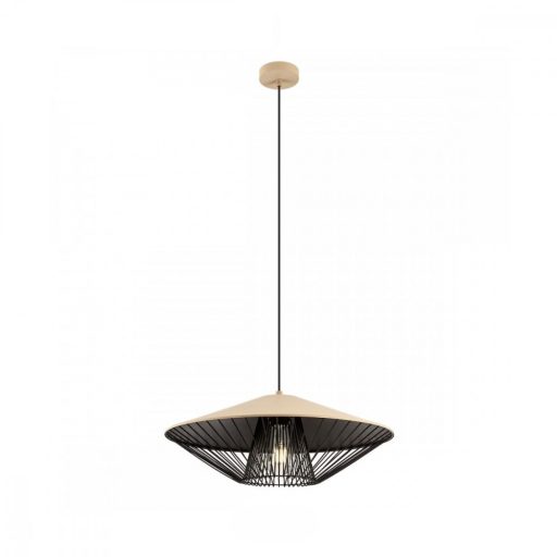 Matt szürkés bézs színű fém vázas függeszték lámpa matt szürkés bézs színű fém ernyővel, fekete fémrács betéttel, 1db E27-es foglalattal.
