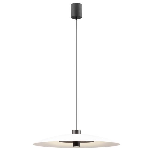 Matt fekete színű fém vázas függeszték lámpa fehér színű, 60cm átmérőjű lámpaernyővel, meleg fehér színhőmérsékletű beépített LED fényforrással. A lámpa direkt és indirekt módon is világít. A fekete korong mögül az ernyőt világítja meg, illetve a központi LED lefelé világít.