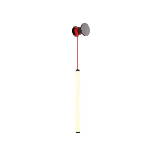 Matt fekete színű fém vázas fali lámpa piros színű textil kábellel, opálos acryl búrával, beépített LED fényforrással. A lámpa színhőmérséklete felszereléskor választaható 3000-4000K között (meleg, természetes). A lámpa fényereje fali kapcsoló segítségével 3 lépcsőben állítható. A lámpa lelógása a textil feltekerésével csökkenthető, kábel hossza 150cm.