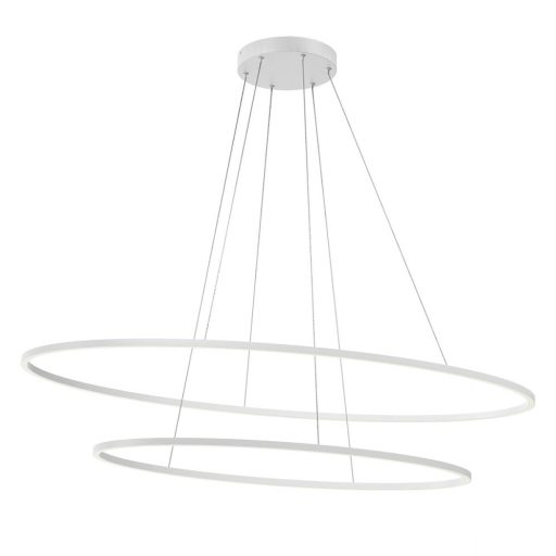 Matt fehér színű alumínium és fém ovális 2 ágú függeszték lámpa PVC betéttel, beépített LED fényforrással. A lámpa fényereje fali kapcsoló segítségével 3 lépcsőben fényerőszabályozható. A lámpa színhőmérséklete felszereléskor választható 3000 vagy 4000K közül (meleg vagy természetes fehér).