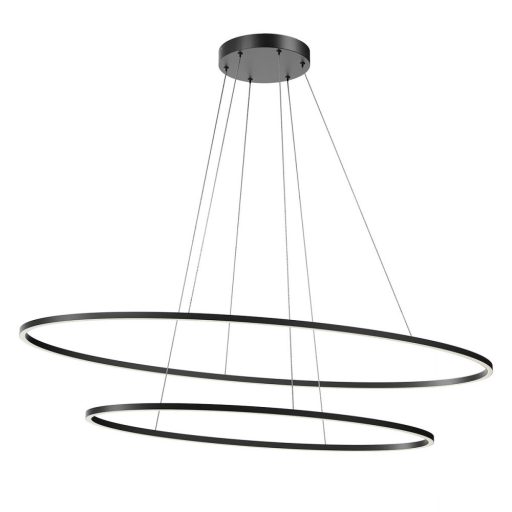 Matt fekete színű alumínium és fém ovális 2 ágú függeszték lámpa PVC betéttel, beépített LED fényforrással. A lámpa fényereje fali kapcsoló segítségével 3 lépcsőben fényerőszabályozható. A lámpa színhőmérséklete felszereléskor választható 3000 vagy 4000K közül (meleg vagy természetes fehér).