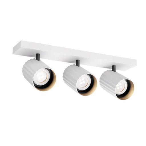 Matt fehér színű fém vázas falra vagy mennyezetre szerelhető spot lámpa bordázott, kívűl matt fehér, belül matt fekete színű alumínium búrával, mozgatható fejjel, 3db GU10-es foglalattal.