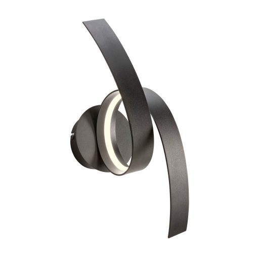 Matt fekete színű fém és alumínium légies megjelenésű falikar fehér PVC betétes, íves búrával, meleg fehér színhőmérsékletű beépített LED fényforrással.