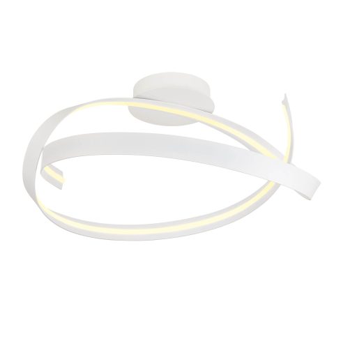 Matt fehér színű fém és alumínium légies megjelenésű mennyezeti lámpa fehér PVC betétes, íves búrával, meleg fehér színhőmérsékletű beépített LED fényforrással. A lámpa fényereje fali kapcsoló fel/le kapcsolásával 3 lépcsőben szabályozható.