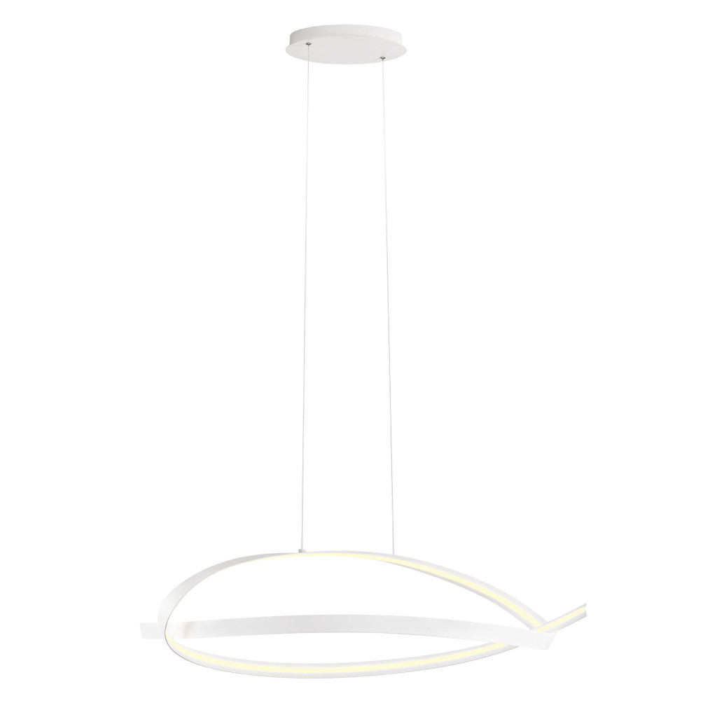 Matt fehér színű fém és alumínium légies megjelenésű függesztett lámpa fehér PVC betétes, íves búrával, meleg fehér színhőmérsékletű beépített LED fényforrással. A lámpa fényereje fali kapcsoló fel/le kapcsolásával 3 lépcsőben szabályozható.
