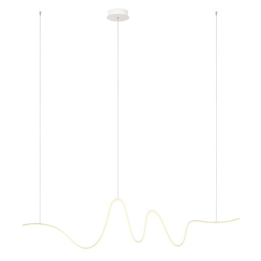 Matt fehér színű fém és alumínium légies megjelenésű függesztett lámpa fehér PVC betétes, íves búrával, meleg fehér színhőmérsékletű beépített LED fényforrással. A lámpa fényereje fali kapcsoló fel/le kapcsolásával 3 lépcsőben szabályozható.