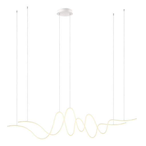Matt fehér színű fém és alumínium légies megjelenésű függesztett lámpa fehér PVC betétes, íves búrával, meleg fehér színhőmérsékletű beépített LED fényforrással. A lámpa fényereje fali kapcsoló fel/le kapcsolásával 3 lépcsőben szabályozható.