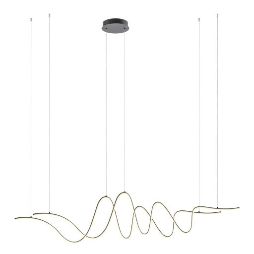 Matt fekete színű fém és alumínium légies megjelenésű függesztett lámpa fehér PVC betétes, íves búrával, meleg fehér színhőmérsékletű beépített LED fényforrással. A lámpa fényereje fali kapcsoló fel/le kapcsolásával 3 lépcsőben szabályozható.