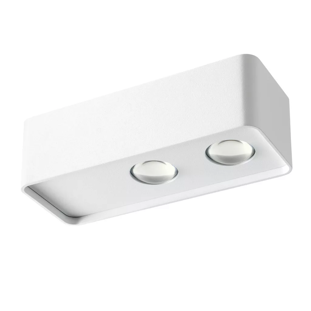 Matt fehér színű fém fali lámpa 2db átlátszó polikarbonát lencsével, meleg fehér (3000K) színhőmérsékletű beépített LED fényforrással. A lámpa csak lefelé világít. Triac változat, egy külön vásárolható speciális kapcsoló segítségével fényerőszabályozható. A kapcsolóról érdeklődjön ügyfélszolgálatunkon.